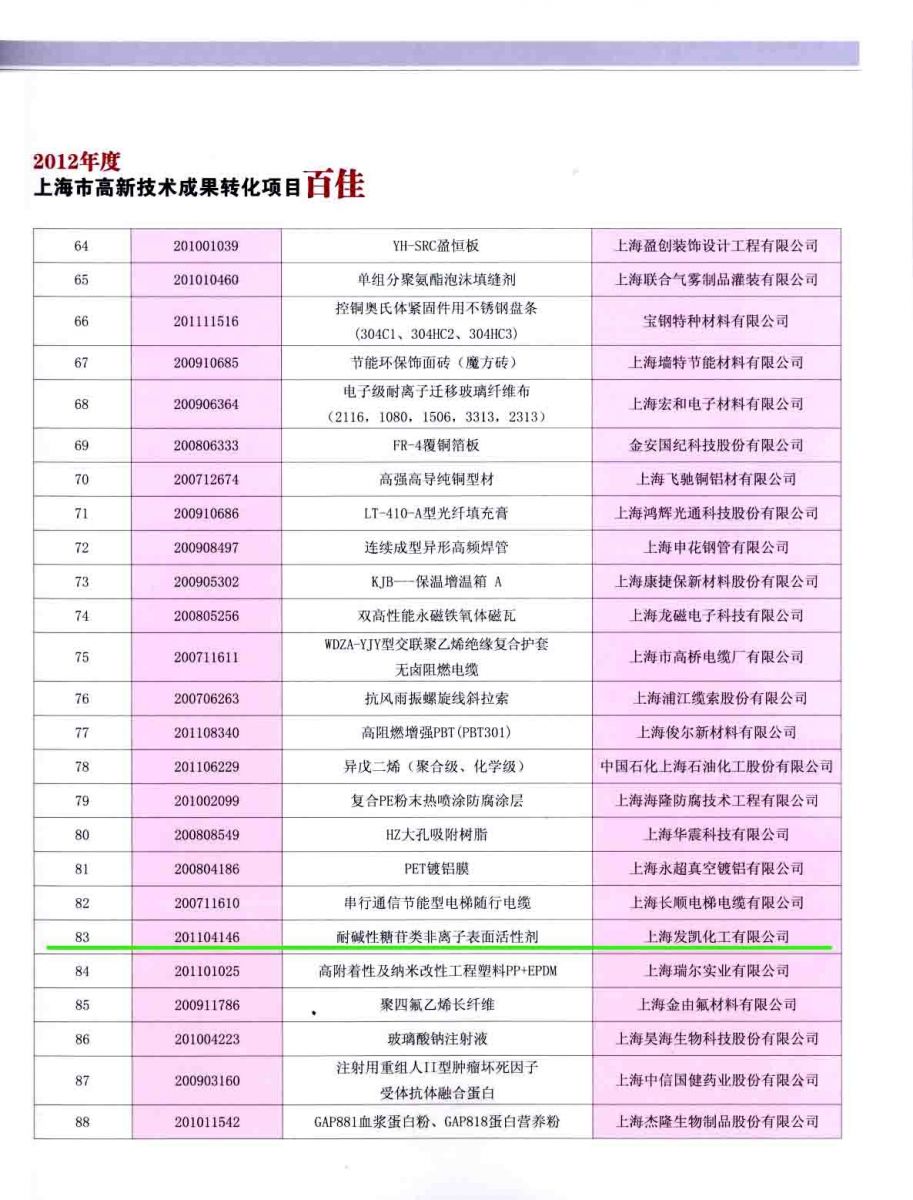 2013年8月23日下午,2012上海市高新技術(shù)成果轉(zhuǎn)化年報發(fā)布暨上海市高新技術(shù)成果轉(zhuǎn)化百佳、自主創(chuàng)新十強項目表彰會在上??茖W(xué)會堂隆重舉行,我司的“耐堿性糖苷類非離子表面活性劑”項目榮獲“2012年度上海市高新技術(shù)成果轉(zhuǎn)化項目百佳”稱號。